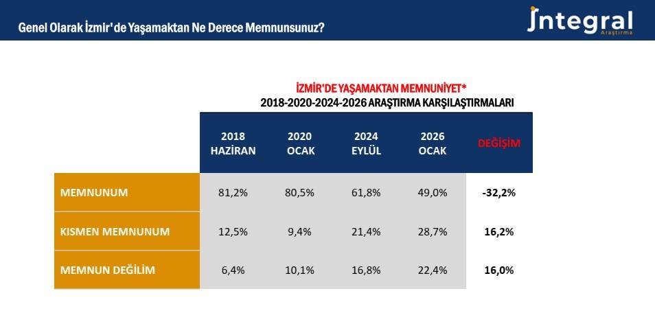 İntegral Araştırma’nın verilerine göre “İzmir’de yaşamaktan memnun musunuz?” sorusuna memnunum diyenlerin oranı 2018 araştırmasında %81’i geçiyorken 2026 Ocak’ta %49’a geriledi. İntegral Araştırma, “Kısmen memnunum ve Memnun değilim” yanıtlarındaki aşırı artışı “Sosyolojik bir deprem” olarak tanımladı. Yapılan açıklamada; İzmir’de yaşam memnuniyetindeki düşüşün ülkenin içinde bulunduğu sosyo-ekonomik-siyasal gidişatın yanı sırayerel yönetimlerin sorumluluk alanındaki temel kentsel hizmetlere erişimdeki sıkıntılarla açıklamanın mümkün olduğu vurgulandı.