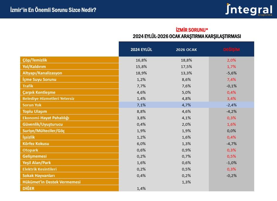İntegral Araştırma tarafından yapılan açıklamada şu görüşlere yer verildi: İzmir, yerel yönetim performansı ile toplumsal beklenti arasındaki makasın tehlikeli biçimde açıldığı bir "Eşik noktasına" doğru ilerlemektedir. Özellikle 2018’den bu yana yaşam memnuniyetinde gözlenen 32 puanlık radikal düşüş, kentin kronikleşen çöp, yol ve altyapı gibi temel belediye hizmetlerindeki yetersizliklerle birleştiğinde, İzmirlilik kimliğinin taşıyıcı kolonu olan "Konforlu yaşam" algısının ciddi bir erozyona uğradığını göstermektedir. Şehrin en önemli sorunlarının %84 oranında yerel yönetim odaklı olması ve "Sorun yok" diyenlerin oranının %4,7 gibi marjinal bir seviyeye gerilemesi, önümüzdeki dönemde seçmen davranışında ideolojik bağlılıktan ziyade "Hizmet odaklı bir kopuş" yaşanma ihtimalini güçlendirmektedir.