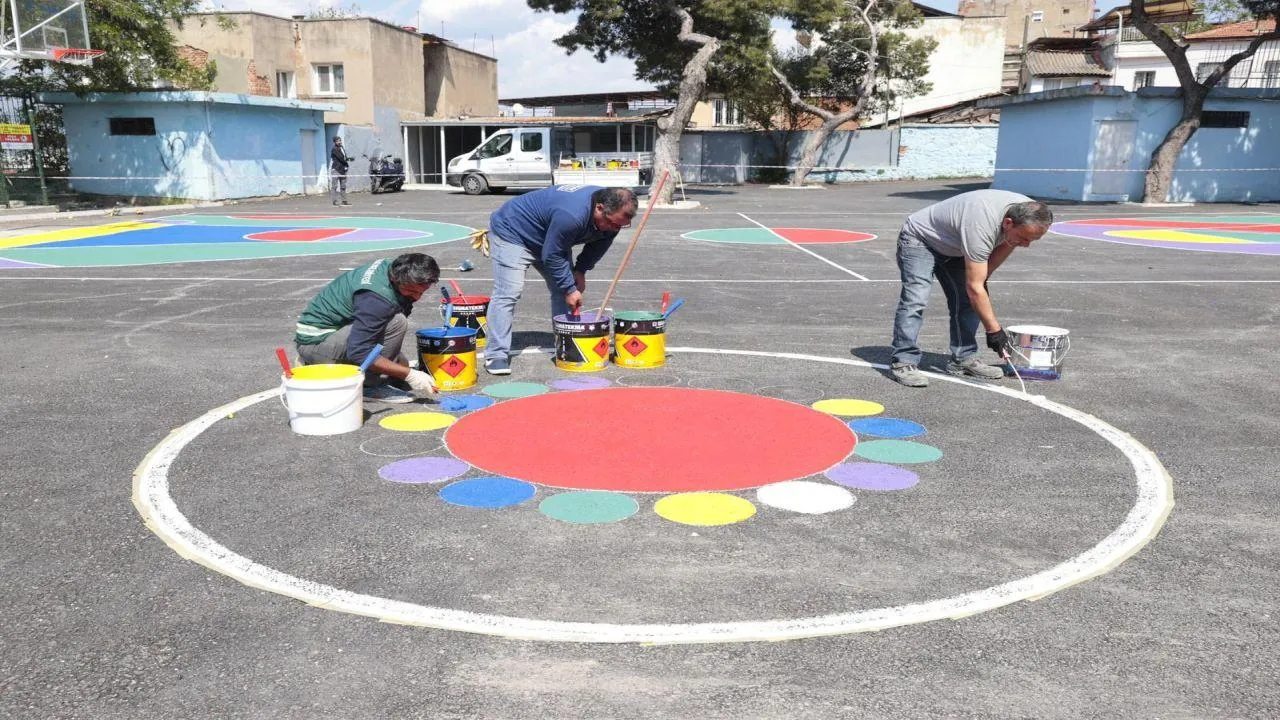 Konak Belediyesi Kentsel Tasarım ve Fen İşleri Müdürlüklerinin ortak çalışmasıyla okullara çıkan sokaklarda hayata geçirilen “Renkli Yol” uygulaması, çerçevesi genişletilerek okul bahçelerine de yayıldı. Çocukların güvenliği ve neşesini artıran uygulama kapsamında Kestelli Şerife Eczacıbaşı Ortaokulu ve Sarıkamış İlkokulu bahçeleri yeniden düzenlenerek yepyeni bir görünüme kavuştu. Her iki okulun da eskimiş ve yıpranmış bahçe zeminleri kazılarak sıfırdan asfalt serildi. Yenilenen asfalt yüzeye, uygun oranlarda basketbol sahaları çizildi. Sarıkamış İlkokulu’nun basketbol sahasının orta alanına resmedilen basketbol topu ise çocuklardan tam not aldı.