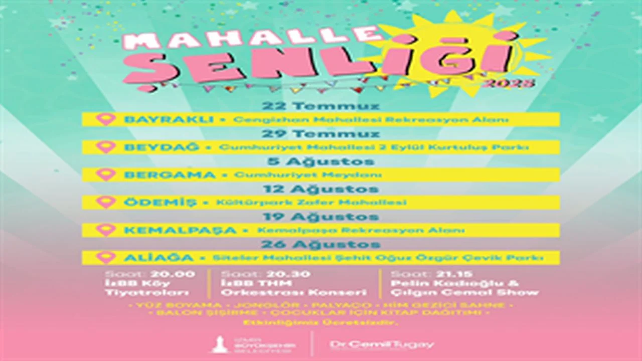 İzmirli yurttaşlar, İzmir Büyükşehir Belediyesi Kültür ve Sosyal İşler Dairesi Başkanlığı organizasyonunda düzenlenecek Mahalle Şenliği ile eğlenceli etkinliklerle buluşacak. Mahalle Şenliği, 22 Temmuz’da Bayraklı Cengizhan Mahallesi Rekreasyon Alanı, 29 Temmuz’da Beydağ Cumhuriyet Mahallesi 2 Eylül Kurtuluş Parkı, 5 Ağustos’ta Bergama Cumhuriyet Meydanı, 12 Ağustos’ta Ödemiş Kültürpark Zafer Mahallesi, 19 Ağustos’ta Kemalpaşa Rekreasyon Alanı ve 26 Ağustos’ta Aliağa Siteler Mahallesi Şehit Oğuz Özgür Çevik Parkı’nda gerçekleştirilecek.